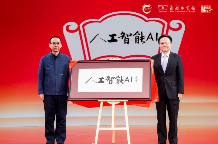 商務(wù)印書館副總經(jīng)理陳晗雨(左),中宣部“學(xué)習(xí)強國”學(xué)習(xí)平臺編委、副總經(jīng)理杜大力(右)揭曉年度國際詞“人工智能(AI)”。新華網(wǎng) 發(fā)