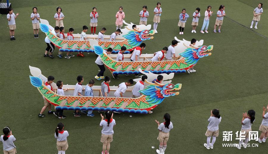6月22日,江蘇省蘇州市留園中心小學(xué)學(xué)生在進(jìn)行“旱地龍舟”比賽。新華社發(fā)(杭興微 攝)