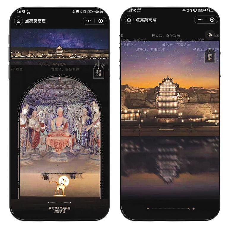 為了感受千年前莫高窟的燃燈民俗,記者迫不及待地體驗(yàn)了一把:進(jìn)入“云游敦煌”官方小程序,通過(guò)“點(diǎn)亮莫高窟”入口,即可欣賞星空下的莫高窟全景,并與萬(wàn)千用戶一起“點(diǎn)亮”崖體上的洞窟。隨著用戶點(diǎn)亮人次增多,畫面中燈光的亮度也隨之增加。至深夜時(shí)分,用戶將會(huì)看到莫高窟崖體上空“銀河”與洞窟光亮相映成輝的景象,體驗(yàn)千年前莫高窟燃燈盛況。“點(diǎn)亮莫高窟”的創(chuàng)意來(lái)自于敦煌文獻(xiàn)中記載的場(chǎng)景,莫高窟燃燈是敦煌歲時(shí)民俗。據(jù)記載,每逢特定的時(shí)間,當(dāng)?shù)孛癖姇?huì)在莫高窟舉行盛大的燃燈活動(dòng),于窟龕點(diǎn)亮燈盞??偀魯?shù)可高達(dá)700余盞。