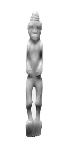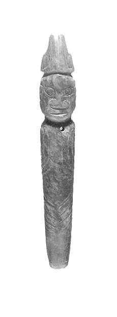 兩件玉人,一為白玉,玉人裸體直立,發(fā)辮虎首蛇身盤成堆髻。長臉,闊鼻,深眼窩,大耳,厚唇前突,兩手捧腹,神情肅穆,玉人背部可見雙臂肘,以及脊柱凹槽。兩腿間“8”形鏤空,雙足并攏作鏟形,有斜刃。玉人無明顯性別特征,但從身軀面相可判定是男性。