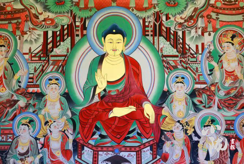 該壁畫(huà)是按照敦煌莫高窟第220窟唐代《無(wú)量壽經(jīng)變》壁畫(huà)為原型,選址鳩摩羅什寺旃檀佛殿正面墻體,由敦煌畫(huà)院畫(huà)師張杰龍臨摹再創(chuàng)作,融入了敦煌莫高窟唐代112窟壁畫(huà)局部經(jīng)變內(nèi)容,與原作既有相似,但又不完全是原作。
