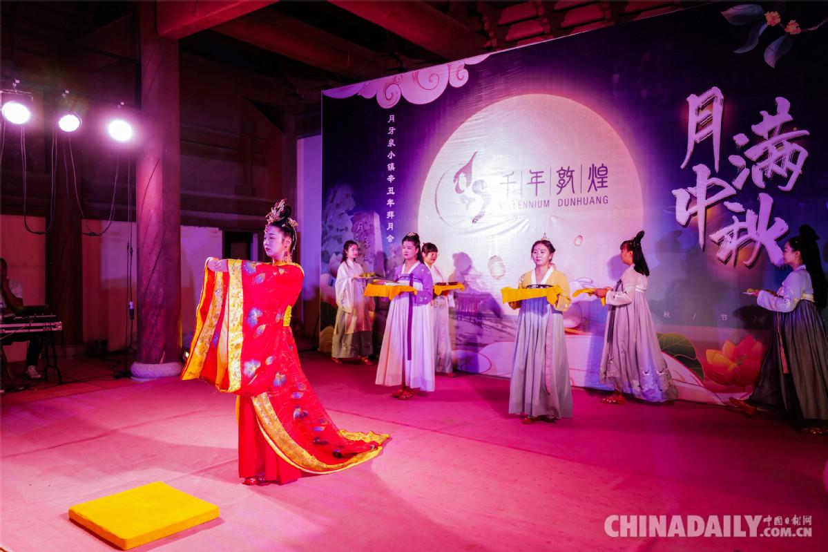 9月21日夜晚,一輪明月升起在大漠敦煌的上空,在中國傳統(tǒng)的中秋節(jié),甘肅敦煌月牙泉小鎮(zhèn)中心廣場舉辦了中秋拜月等民俗活動。先舉行了仿古“拜月大典”。伴隨著深沉悠揚的樂曲,身穿華麗漢服的參祭女子手捧月餅及各式貢品緩步登臺,在皓月銀輝中虔誠致祭;按照敦煌習俗,主祭三上香、三祭酒,并于月光與燭光映照之中,向月誦祝。按照傳統(tǒng)儀式祭拜禮成后,主祭將月餅與水果分發(fā)給現(xiàn)場拜月的市民游客,與大家共享中秋拜月祭品。隨后還進行了中國傳統(tǒng)民族服裝——旗袍展示、漢服秀、歌舞演出等形式多樣的民俗活動。當日晚,小鎮(zhèn)人來人往非常熱鬧,眾多敦煌市民和游客參加拜月活動,受疫情影響,部分活動在網(wǎng)上進行,不少媒體人,對敦煌賞月、拜月活動進行了網(wǎng)絡直播。
