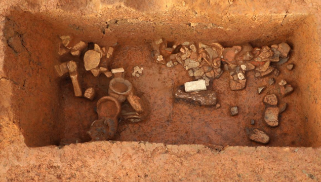 圪垯川遺址從仰韶文化早期延續(xù)至仰韶文化晚期,年代距今6100年至5600年。其中仰韶文化早期史家類型時(shí)期的大型環(huán)壕聚落保存較完好,面積約8萬(wàn)平方米,聚落外圍發(fā)現(xiàn)三道環(huán)壕,中心區(qū)為一處廣場(chǎng),圍繞廣場(chǎng)呈向心狀分布三組房屋,共計(jì)100余座,每組房屋由1座大房屋(約100平方米)和數(shù)量不等的中型房屋(約20-50平方米)、小型房屋(20平方米以下)組成。房屋間發(fā)現(xiàn)數(shù)座袋狀窖穴,最大一座位于中心廣場(chǎng),容積約60立方米,底部保存近0.4至0.6米厚的炭化粟黍遺存??碧桨l(fā)現(xiàn)環(huán)壕外東南部疑似有陶窯區(qū),西北部疑似有墓葬區(qū)。遺址出土大量陶器、石器、玉器、骨器等,陶器以彩陶為主,包括尖底瓶、平底缽、葫蘆瓶等,還發(fā)現(xiàn)一件玉權(quán)杖首。炭化植物遺存鑒定以粟黍?yàn)橹?,且以黍?yàn)槎?。?dòng)物骨骼遺存鑒定主要為家養(yǎng)動(dòng)物豬、狗和野生動(dòng)物鹿、狍等。