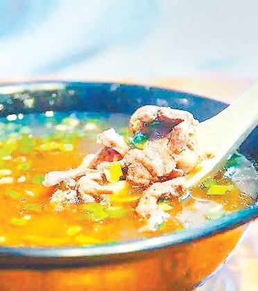 東門巷、喇家巷的牛雜割也上演著與肉酒一樣的故事,冬日里的牛雜割鋪?zhàn)涌偸切v騰的,在雜割湯翻滾的撲鼻中,一碗又一碗的雜割端上桌了。蒜苗與芫荽沫作為菜頭,讓一碗牛雜割青綠且香味撲鼻,拿了筷子,手心里一抹,而后咽一下口水,吸溜一口湯,目光跟著筷子在碗里攪動(dòng),留意牛舌多了一塊還是蹄筋少了,先巡察一番,然后咬一口白餅,喝口湯,幾口之后才吃雜割。