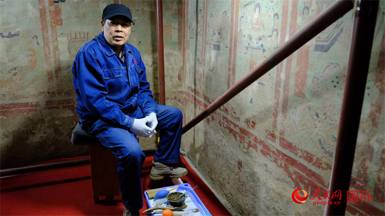 敦煌研究院文物保護修復(fù)工作者劉濤在工作現(xiàn)場。人民網(wǎng) 呂強攝