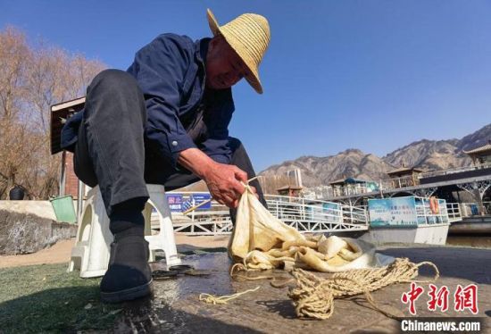 2月24日,春日暖陽下,今年70多歲的省級羊皮筏子非遺傳承人張德寶在蘭州黃河邊制作羊皮筏子,為迎接旅游旺季到來提前做好準(zhǔn)備。劉玉桃 攝