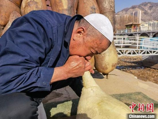 張德寶將處理好的羊皮扎好,留下一個口,往里面吹氣,使其鼓起來,最后捆扎在木架上完成。張德寶介紹說,1個羊皮囊他最快可以用30秒吹好,用嘴吹氣,其溫度和濕度更適宜羊皮筏子保存,如果使用過程中漏氣了,也需靠人吹補(bǔ)氣。(記者 劉玉桃)