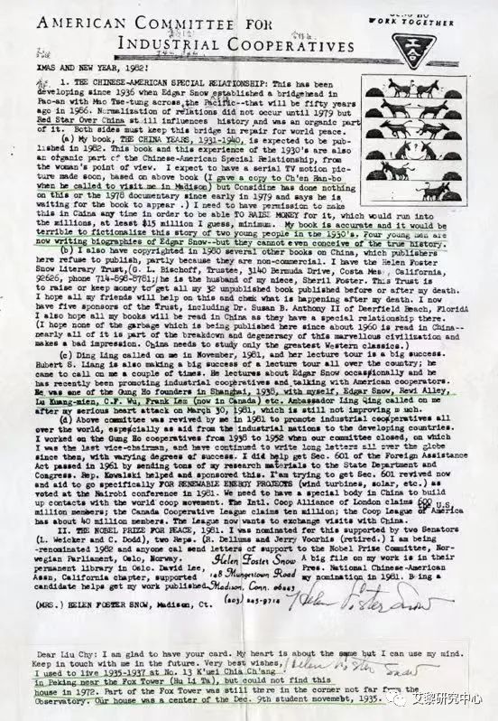 中美友誼和文化交流的偉大架橋者海倫·斯諾一生致力于推廣“工合”運(yùn)動,她于1937年底參與發(fā)起“中國工業(yè)合作社”抗戰(zhàn)自救運(yùn)動(簡稱“工合”,Gung Ho)。到了晚年,她仍然在孜孜不倦地傳播“工合”理念。她的這一信念和堅持,可以從她巧妙地將一幅卡通畫印在自己特制信箋抬頭上看得出來。