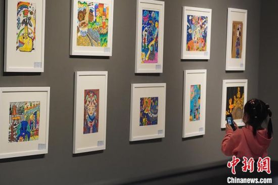 小朋友參觀少兒美術(shù)展覽,用手機(jī)拍照留影。