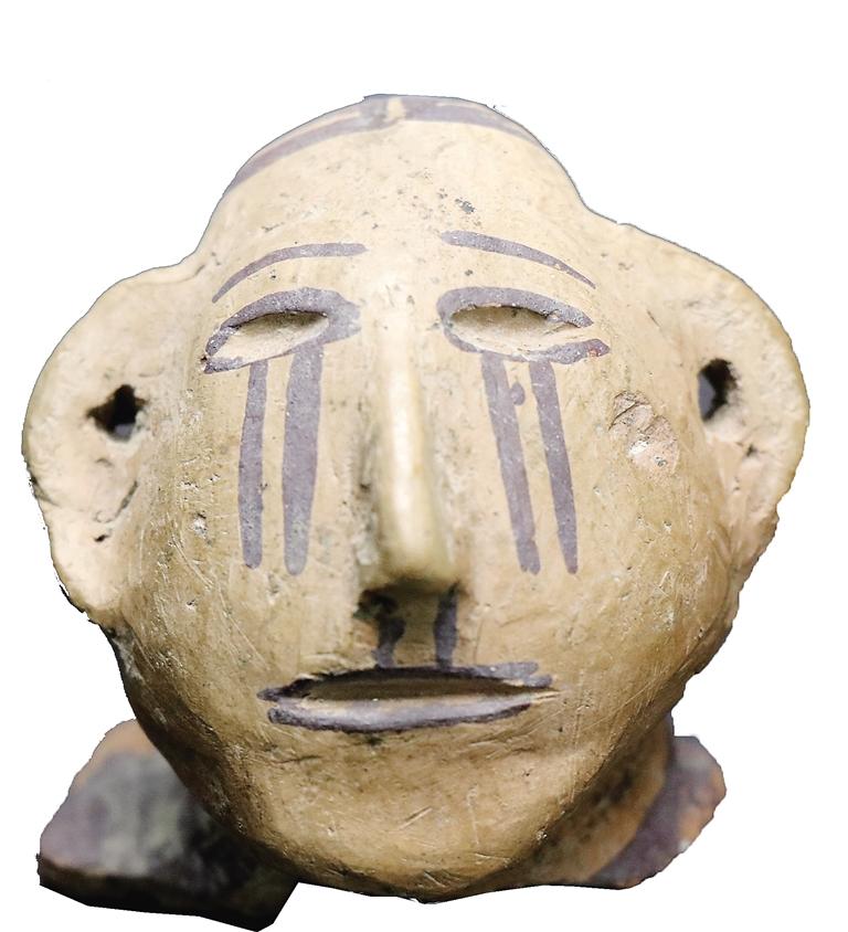 姓名:馬家窯文化馬廠類型人頭形彩陶器蓋 出生年代:距今約4350—4050年左右 住址:臨夏市博物館 體型:面部長6.5厘米,寬6.5厘米,頭頂至后頸長5.5厘米 自我描述: 我是國家一級文物。1992年,博物館工作人員從臨夏市王坪村村民手中收購了我。我是由泥質(zhì)紅陶捏塑而成,我的表面略磨光,施黑彩,窄額長臉,橢圓形眼,繪有眉毛,眼窩深陷,高鼻有鼻孔,雙耳較長、呈半圓形,雙耳有小孔,大嘴微張,發(fā)式為直發(fā)、中分。頭發(fā)、眼輪廓線、嘴輪廓線均為黑彩繪就。特別值得一提的是,在我的雙眼下方臉頰上的雙直線條,仿佛是奪眶而出的眼淚。