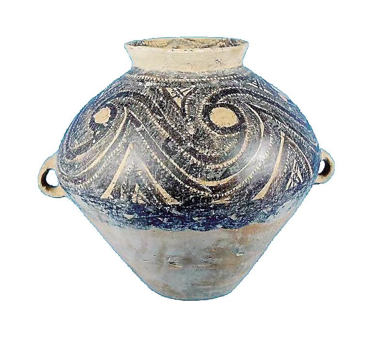 姓名:馬家窯文化半山類型漩渦紋雙耳彩陶罐 出生年代:距今約4650—4350年左右 住址:積石山縣博物館 體型:高34厘米,口徑15.7厘米,腹徑109.9厘米,底徑13厘米 自我描述: 我是國家二級文物。我們半山類型彩陶家族成員主要有大型貯藏器壺、甕、罐等。1988年積石山縣癿藏鄉(xiāng)吊地屲村一村民將我捐贈給博物館。泥質(zhì)紅陶造就的我,撇口,束頸,溜肩,腹部飾對稱的雙耳,施黑彩,肩腹部有四方連續(xù)漩渦鋸齒紋,下飾一周水波紋。胎體光亮,紋飾細(xì)膩規(guī)整。
