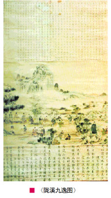 “隴溪九逸”每逢集會(huì),必懸此圖。他們繼承中國(guó)文人優(yōu)良的傳統(tǒng)美德,“居廟堂之高則憂其民,處江湖之遠(yuǎn)則憂其君”,看似醉情山水,實(shí)則壯心不已,制訂鄉(xiāng)約,設(shè)館授徒,為家鄉(xiāng)的文化教育事業(yè)發(fā)揮著余熱。從這個(gè)意義上說(shuō),明代秦安“隴溪九逸”正是古代知識(shí)分子憂國(guó)憂民的一個(gè)縮影,亦是那個(gè)時(shí)代的一抹春色。