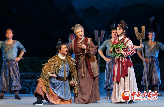 隴劇《大禹治水》是在甘肅省文化和旅游廳全程指導(dǎo)下,《黃河流域生態(tài)保護(hù)和高質(zhì)量發(fā)展規(guī)劃綱要》出臺(tái)之際,甘肅文藝工作者挖掘黃河文化蘊(yùn)含的時(shí)代價(jià)值,講好“黃河故事”,實(shí)施隴原文藝高峰攀登工程、加強(qiáng)非物質(zhì)文化遺產(chǎn)保護(hù)傳承的具體行動(dòng)。該劇將“大禹”這個(gè)上古英雄請(qǐng)下神壇,為他賦予了親情、愛(ài)情、家國(guó)情懷,在兩個(gè)小時(shí)的演出中,領(lǐng)銜出演“大禹”的優(yōu)秀青年演員邵炳德與雷通霞、竇鳳霞、佟紅梅等“三朵梅花”同臺(tái)飆戲,火花四濺的“開山”、扣人心弦“治水”,將大禹和先民們不畏艱險(xiǎn)、篳路藍(lán)縷的開拓精神和奮斗精神,演繹得淋漓盡致,深深震撼著現(xiàn)場(chǎng)觀眾。而隴劇音樂(lè)獨(dú)有的“麻簧”、以皮影戲?yàn)楸憩F(xiàn)手法的“月下婚禮”場(chǎng)景、水袖舞場(chǎng)景,把人物的情緒表現(xiàn)得栩栩如生,將獨(dú)具特色的隴劇藝術(shù)盡情綻放在舞臺(tái)之上。