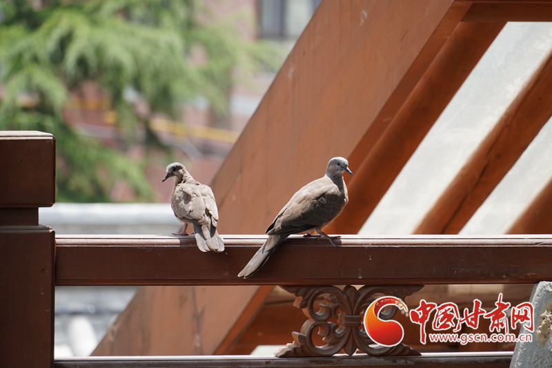 天水古城內(nèi),一只鳥飛向欄桿,隨后兩只鳥同在欄桿上站立不動(dòng)。