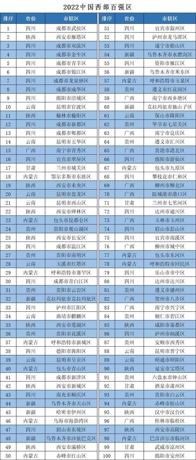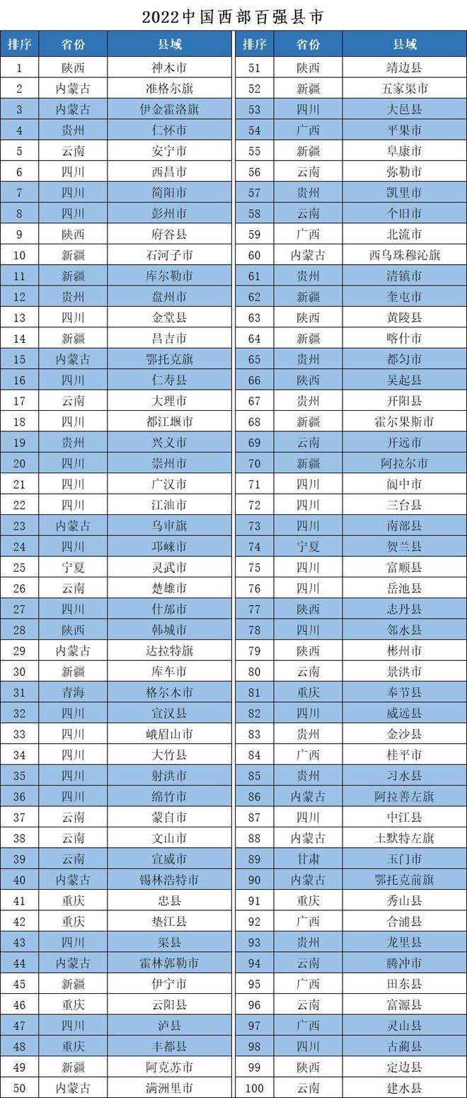 《中國西部地區(qū)縣域發(fā)展監(jiān)測報告》由競爭力智庫、北京中新城市規(guī)劃設計研究院等機構聯(lián)合編制,監(jiān)測評價對象為西部12個?。ㄗ灾螀^(qū)、直轄市)的全部縣域單位,從經濟規(guī)模、人民生活、經濟活力、發(fā)展質量等四個方面進行評價,四個分項指數(shù)合成競爭力指數(shù)。其中,縣(縣級市、自治縣、旗、自治旗、特區(qū))競爭力指數(shù)前100名為“中國西部地區(qū)綜合競爭力百強縣市”,簡稱“中國西部百強縣市”或“西部百強縣”;市轄區(qū)競爭力指數(shù)前100名為“中國西部地區(qū)綜合競爭力百強區(qū)”,簡稱“中國西部百強區(qū)”或“西部百強區(qū)”。今年,課題組在開展西部地區(qū)縣域發(fā)展監(jiān)測評價的基礎上,還聯(lián)合有關單位和專家,分區(qū)域、分類型總結了“2022中國西部地區(qū)縣域高質量發(fā)展典型案例”,準格爾旗、平果市、仁壽縣、彭州市、瀘縣、吳起縣、玉門市、開陽縣、大竹縣、彬州市、成都市雙流區(qū)、西安市雁塔區(qū)、昆明市官渡區(qū)、包頭市昆都侖區(qū)、克拉瑪依市克拉瑪依區(qū)、貴陽市觀山湖區(qū)、南寧市青秀區(qū)、蘭州市城關區(qū)、西寧市城西區(qū)、銀川市興慶區(qū)等20個縣(市、區(qū))入選典型案例名單,供全國交流學習。