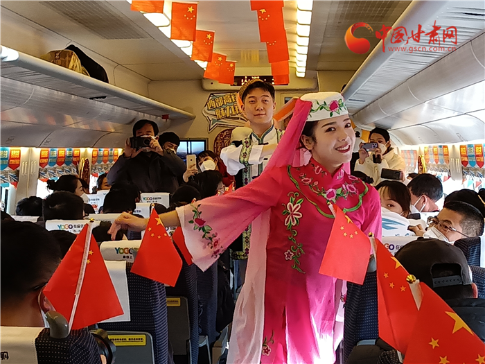 飛天與花兒相擁,甘肅與寧夏直通。蘭銀高鐵中蘭段開通,也讓銀蘭高鐵全線貫通。為了慶祝這一歷史時刻,D9058次列車乘務組準備了精彩的節(jié)日?!痘▋号c少年》展演寧夏風情,遇見塞上花開。敦煌樂舞,充滿甘肅元素講述飛天故事,巧妙的節(jié)目安排生動地展示了甘肅、寧夏兩省區(qū)的文化元素,讓旅途不僅有一路風光,更有一路風情。
