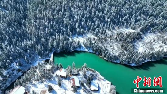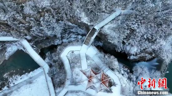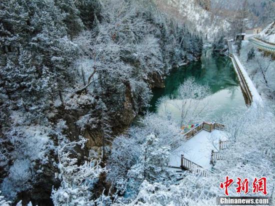 航拍甘南大峪溝雪景,銀裝素裹美如畫。(卓尼縣融媒體中心 供圖