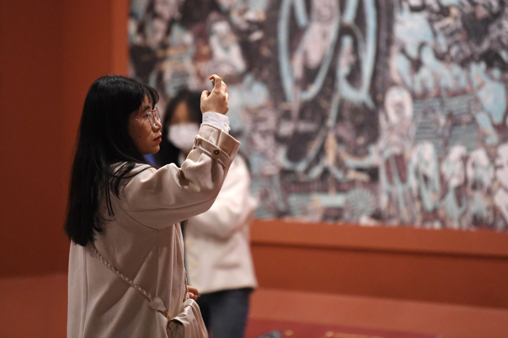 當(dāng)日是清明節(jié)假期,眾多市民和游客來(lái)到位于蘭州黃河岸邊的敦煌研究院蘭州分院敦煌藝術(shù)館參觀“打卡”,欣賞“覺(jué)色敦煌 莫高精神”敦煌石窟藝術(shù)展,近距離感受敦煌文化藝術(shù)的魅力。