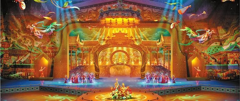 “樂動敦煌文旅產(chǎn)業(yè)綜合體”是集歷史文化、數(shù)字創(chuàng)意、沉浸演藝、特色市集、藝術(shù)文創(chuàng)為一體的甘肅省列重點文旅產(chǎn)業(yè)項目。作為其中主要項目的沉浸式旅游演藝劇《樂動敦煌》,是由甘肅省委宣傳部策劃、甘肅演藝集團(tuán)創(chuàng)排出品的全球首部洞窟式沉浸體驗劇。該劇溯源敦煌文化,借助現(xiàn)代技術(shù)對莫高窟壁畫、古籍進(jìn)行解讀,用全息投影、3D威亞等高科技手段,以全沉浸式的呈現(xiàn)方式,演繹西域少年追尋藝術(shù)的傳奇故事。劇中運用了琵琶、排簫、阮等民族樂器及仿制敦煌古樂器的音色,通過胡旋舞、腰鼓舞、琵琶舞等典型舞蹈,展現(xiàn)了敦煌壁畫中的樂舞盛景,全面展現(xiàn)敦煌傳承千年的樂舞文化魅力。
