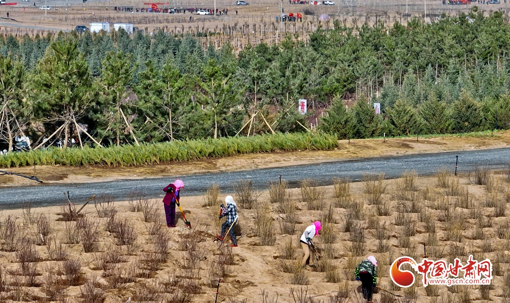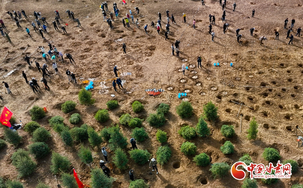 4月11日,在甘肅省張掖市甘州區(qū)黑河西岸黑河灘彩虹林海生態(tài)造林示范區(qū)內(nèi),眾多干部職工正在植樹(shù)。