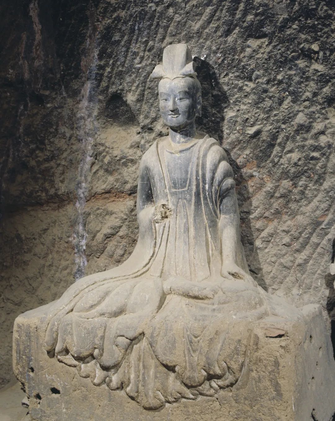 從題材上看,以單尊佛、菩薩、力士等為主,風(fēng)格上更具有寫實性。造像面相橢圓飽滿,斜眉吊目,懸鼻小口,表情森嚴(yán)、凝重,服飾簡潔、質(zhì)樸,寬博厚重,極富質(zhì)感。其中佛低平螺髻,前置肉髻珠,身穿垂領(lǐng)袈裟。菩薩束發(fā)高髻或戴風(fēng)帽,眉目慈祥,身材比例協(xié)調(diào)、準(zhǔn)確。力士表情生動傳神,體形孔武雄健,充滿陽剛之氣,給人以強(qiáng)烈的力量和威武感;這段時間造像前衰后盛也與當(dāng)時秦州所處環(huán)境有密切關(guān)系。