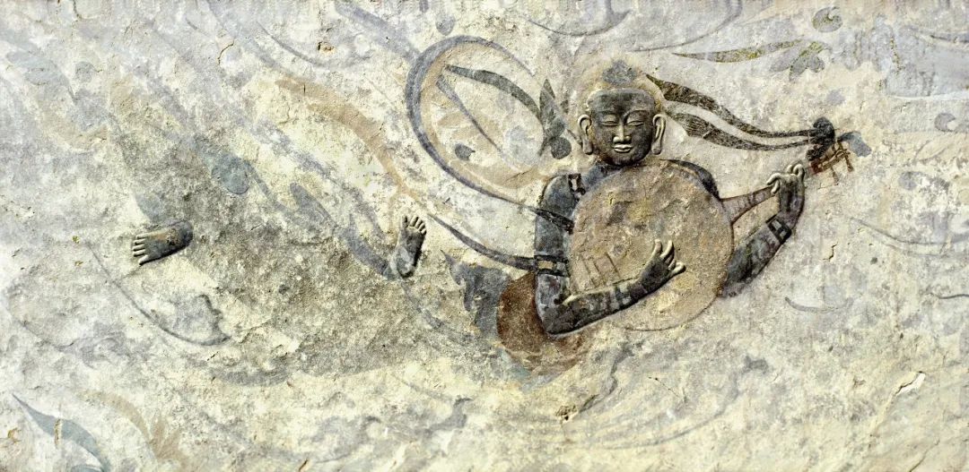 ▲第4窟頂部薄肉塑伎樂飛天,北周時期。