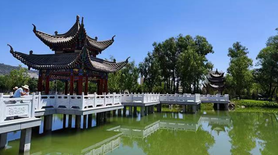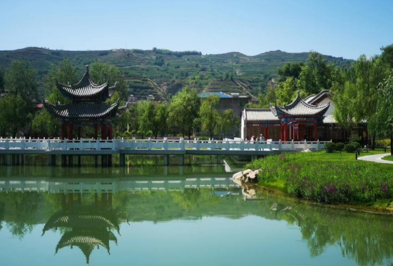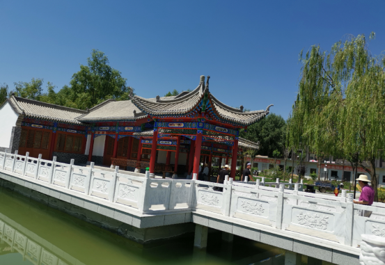 為景點(diǎn)命名。綜合考察廣河歷史文化遺存,細(xì)致視察公園營(yíng)造之特色,遂將其命名為大夏公園,并結(jié)合園內(nèi)景點(diǎn)布局、建筑特色、用途等,為亭、榭、湖、軒、橋等景點(diǎn)命名,如齊家亭、半山亭、天保廊、鐘鼎山房等。最讓人心曠神怡處,當(dāng)為波光粼粼的湖面,因形狀頗似如意,故命名為如意湖,而分東西橫臥在湖面最狹窄處的兩座握橋,分別命名金龍橋、玉鳳橋。