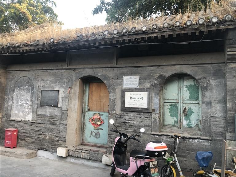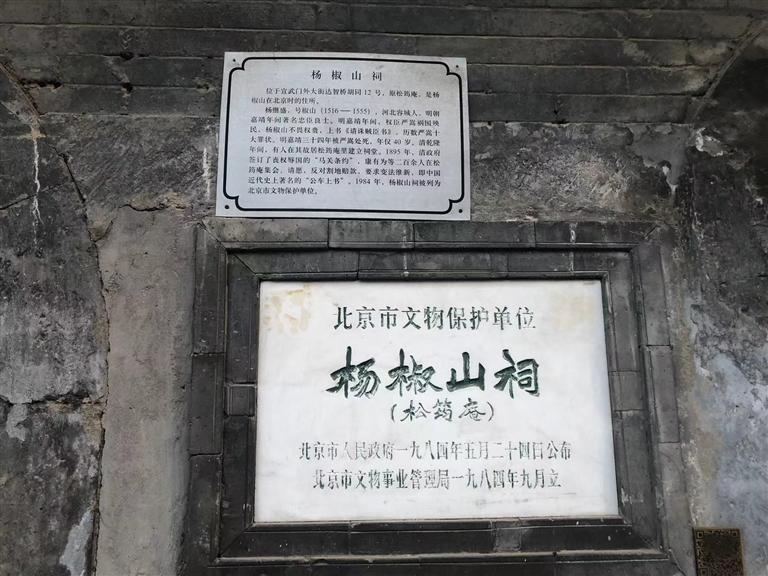 就是在這個(gè)胡同里,我看到一個(gè)歇山式屋頂?shù)姆课?,但已相?dāng)?shù)钠茢?,屋頂上長(zhǎng)滿了凄凄荒草,門(mén)窗皆已破爛不堪。但是門(mén)旁的墻壁上卻鑲嵌著一塊匾,近前一看,上面寫(xiě)著“楊椒山祠”。喲,這就是楊椒山在北京的祠。