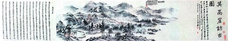 民國(guó)初年,張維返回蘭州之后,仍然念念不忘敦煌經(jīng)卷,曾三赴河西考察敦煌莫高窟。1940年,張維第三次考察敦煌莫高窟返回途經(jīng)武威時(shí),前往拜訪好友、甘肅近代著名書(shū)畫(huà)家范振緒,為其講述敦煌莫高窟的坎坷境遇與現(xiàn)狀。在交流中,張維請(qǐng)范振緒繪制《敦煌訪古圖》畫(huà)卷。1941年,范振緒繪制完成之后,張維將此圖帶回蘭州,并邀請(qǐng)張大千、于右任、高一涵、馮國(guó)瑞、曹經(jīng)沅等著名詩(shī)人題詠。
