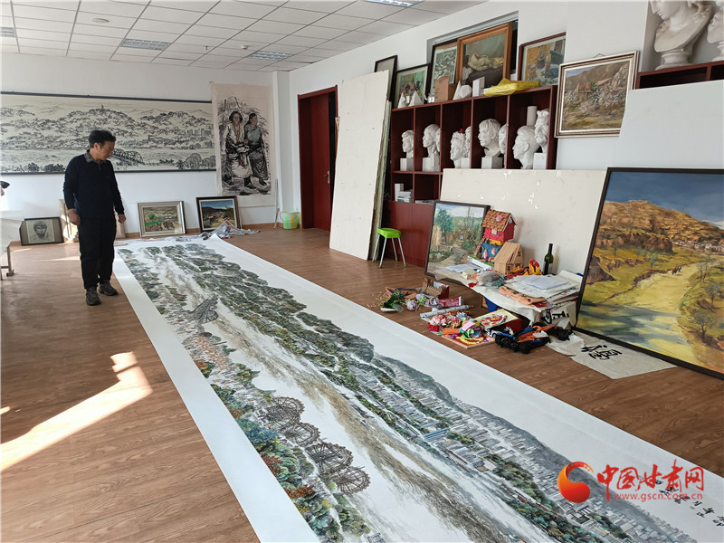 7年前,李建春曾經(jīng)在黑板上素描畫蘭州中山橋、白塔山走紅,在他的筆下蘭州就是一幅畫。這些年,李建春老師靜心創(chuàng)作,希望將蘭州的人文符號(hào)通過長卷表達(dá)出來。