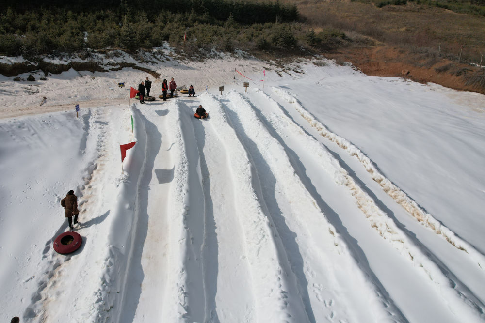 1月16日,在渭源縣田家河鄉(xiāng)元古堆村冰雪樂(lè)園,游客在滑雪圈。新華社記者 方欣 攝
