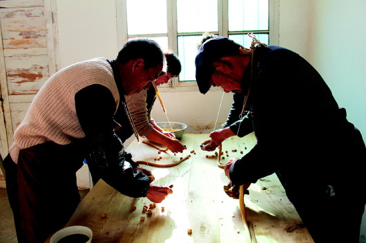 七十二行,釀酒、熬糖最繁瑣。香甜的麥芽糖,如同世間的其他事物一樣,都是通過(guò)勞苦換來(lái)的,正所謂苦盡甘來(lái)。田新民做灶糖用的是麥芽糖,首先要將原料小麥浸泡生芽,然后生成麥芽,不過(guò)有了麥芽,還要經(jīng)過(guò)多道工序才能變成麥芽糖。通常泡發(fā)麥芽之后,接下來(lái)就是蒸制配料,要依次進(jìn)行碾米、浸泡籠蒸、擠糖汁、二次籠蒸,再用力將麥芽搗碎,拌入蒸熟的黃米裝缸,加開水浸泡,淋出第一遍糖汁,再加開水淋出第二遍糖汁。然后再把兩次淋出的糖汁,倒至鐵鍋內(nèi)加小火,用木锨或木棒攪動(dòng),使水分蒸發(fā)凝結(jié)成固體,最終即得麥芽糖。熬糖要反復(fù)三次,經(jīng)過(guò)六個(gè)小時(shí)才能成功。田新民說(shuō):“這樣熬出來(lái)的糖,密封好后,埋在地下很多年都不會(huì)壞。”