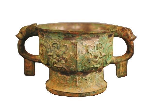 器物保存完整,紋飾十分講究,造型圖案十分精美,為國(guó)家一級(jí)文物。通高14.6厘米,口徑19厘米,底徑14.3厘米。鑄造工藝在西周時(shí)期屬于較為上乘之作。夔紋是圖騰紋飾,《說(shuō)文》中云:“夔如龍而一足。”簋的兩邊為耳,呈環(huán)狀。上部各有一變形的龍首,顯得十分莊重、大氣。整個(gè)器物周身布滿(mǎn)綠銹,脫銹之處露出青銅光澤,透出歷史的厚重之美。