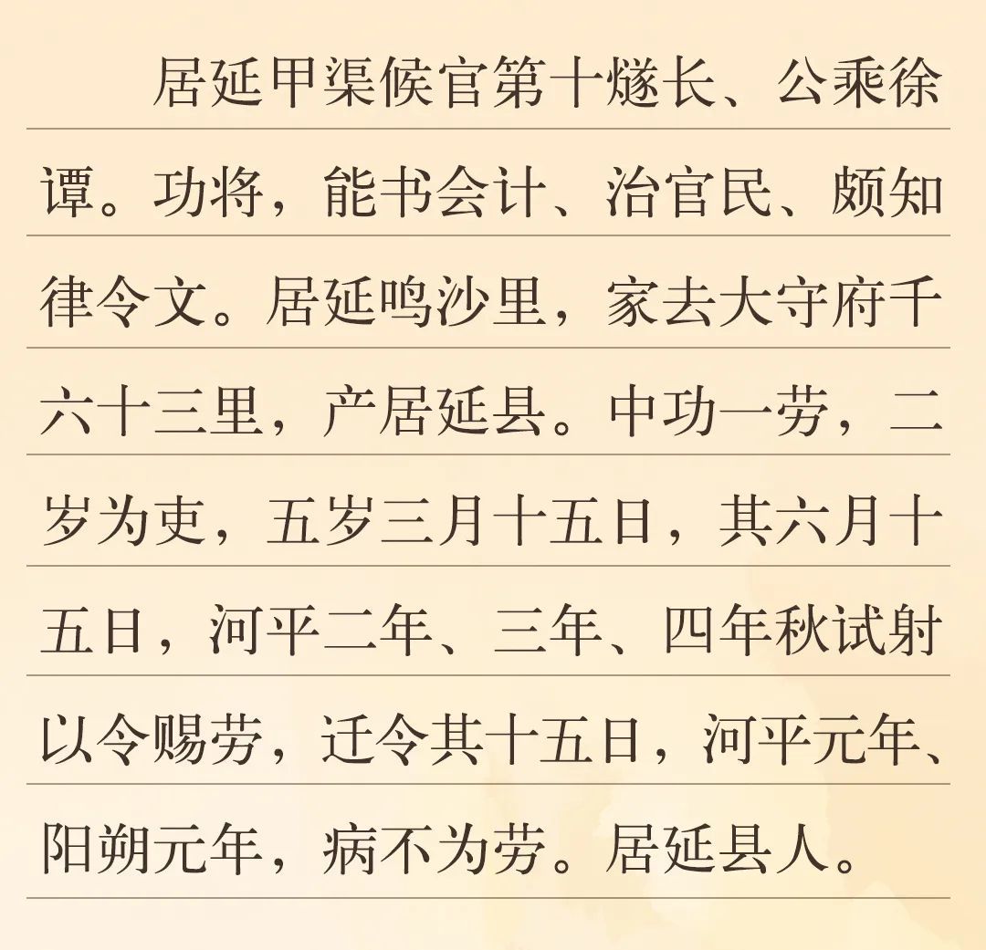 此簡1972年出土于破城子甲渠候官遺址,分三段書寫。內(nèi)容為居延甲渠候官第十燧長徐譚的功將文書。“功將”即“功勞墨將”,功勞墨將文書指官吏個(gè)人才能與勞績的登記名單,是官方對(duì)官吏功勞下發(fā)的認(rèn)定通知。