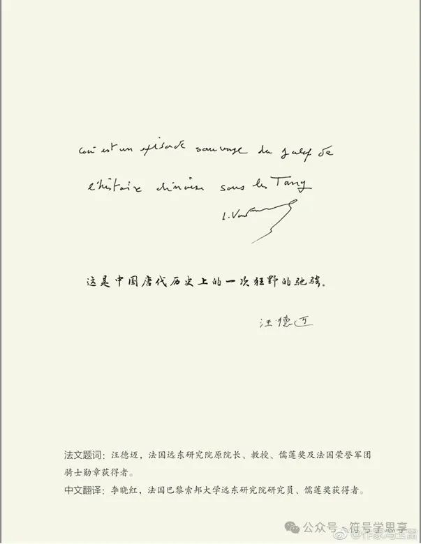 汪德邁先生對(duì)于馮玉雷這部作品給予高度評(píng)價(jià),2018年專門題辭:“這是中國(guó)唐代歷史上的一次狂野的馳騁。”馮教授專門把汪德邁先生給他的法文與中文題辭作為題簽印在書(shū)封面上,他多次跟我說(shuō):“幸遇汪德邁教授、李曉紅教授,受益良多,感激之情,難以言表。”