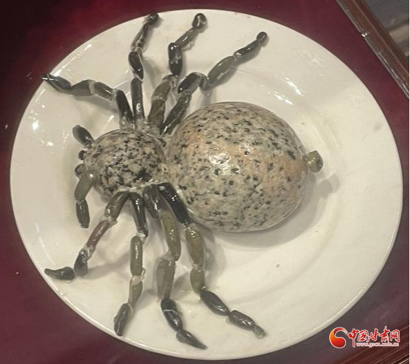 兩個(gè)花紋沒啥特點(diǎn)、一大一小的圓形石頭,再加上更細(xì)小的石粒,竟然被創(chuàng)作者粘連起來,打造成了一只“蜘蛛”,惟妙惟肖。