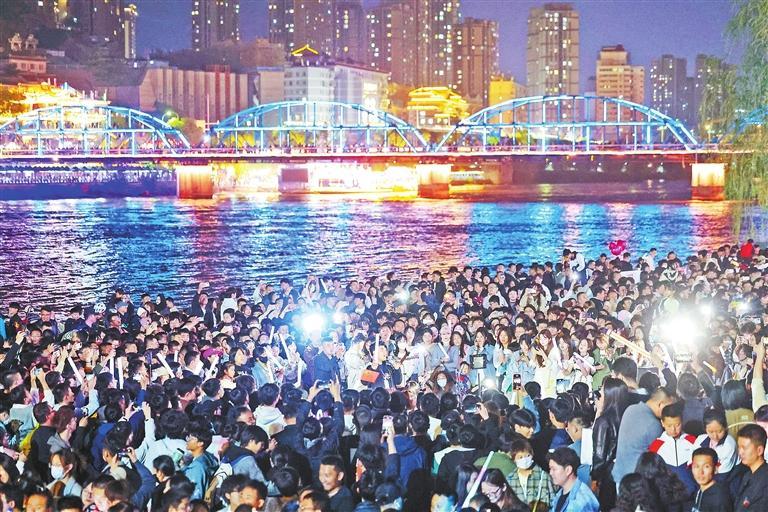 作為蘭州的地標(biāo)之一,中山橋已經(jīng)是來蘭游客必“打卡”的景點(diǎn)?;馃?ldquo;出圈”的“黃河大合唱”成為蘭州旅游新體驗(yàn)。華燈初上,游客和市民齊聚黃河岸邊,隨著音樂齊聲合唱,場面壯觀,氣氛熱烈。“五一”假期首日,蘭州文旅市場迎來火爆“開門紅”,接待游客達(dá)到了86.42萬人次。