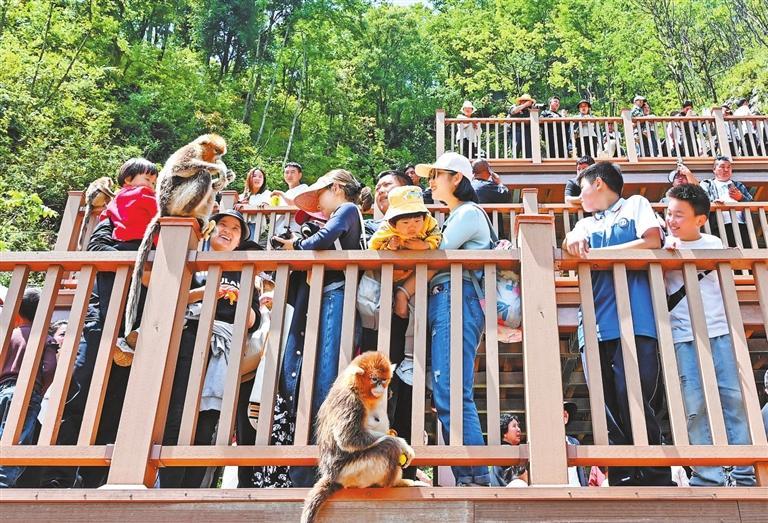 游客在隴南市武都區(qū)裕河鎮(zhèn)與川金絲猴親密接觸。新甘肅·甘肅日報(bào)記者 丁凱