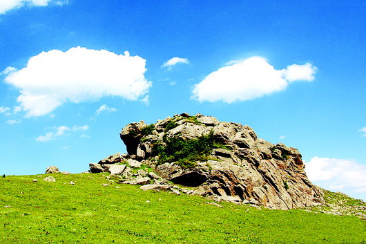 秦人遠(yuǎn)去了,只留下那些讓后人至今懷想不已的地名,諸如石鼓山、景墩梁、牧馬梁、上店子、下店子、大卜峪、瓦泉峪等,而尤以石鼓山最為著名,著名得連那部白發(fā)三千丈的《水經(jīng)注》里,都記載著它的故事:“山在梧中聚,有石鼓不擊自鳴,鳴則兵起。漢成帝鴻嘉三年,天水冀南山有大石自鳴,聲隱隱如雷,有頃止,聞?dòng)谄较宥偎氖?,野雞皆鳴。石長(zhǎng)丈三尺,廣厚略等,在崖勒,去地百余丈,民俗名曰石鼓。”石鼓山是朱圉山最高峰,海拔2625米,山峰陡峭,人跡罕至,遠(yuǎn)望如石鼓,近看似臥牛,茂林幽泉,森秀無(wú)比。初春時(shí)節(jié),萬(wàn)物透綠而石鼓白雪皚皚;大雨前夕,飛鳥(niǎo)翱翔而山上煙云彌漫。更為神奇的是,山丘之巔,突兀一石,酷似一頭臥北朝南的耕牛,翹首做犀牛望月之狀,人稱(chēng)臥牛山。臥牛山石頸之下,有一巨石,其面圓而平,每當(dāng)正午陽(yáng)光直射之時(shí),遠(yuǎn)遠(yuǎn)望去,石面宛如獸皮所蒙,恰如一面威風(fēng)凜凜的巨型戰(zhàn)鼓,恍惚之中,有如雷聲隱隱而來(lái),民呼之曰石鼓,石鼓山因此得名。石鼓山素來(lái)以厚重的人文歷史和優(yōu)美的草原風(fēng)光而著稱(chēng),尤為聞名的“石鼓擎雪”,自古就是“甘谷八景”之一。千百年來(lái),石鼓山甘愿舍棄繁華,遠(yuǎn)離人世,在淡泊寧?kù)o的歲月中,固執(zhí)而堅(jiān)定地守望古坡,守望古坡人家。
