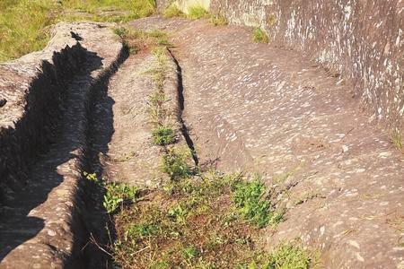 石道坡所在的鹿山,石層上面覆蓋的是厚厚的黃土層。行走在底部的石道上,可以看到石道南壁人工鑿成的垂直的石壁,北側(cè)有護(hù)欄,護(hù)欄外側(cè)為自然形成的崖壁。石道總長(zhǎng)近360米,中部石道上有長(zhǎng)期碾軋形成的車轍,車轍深0.25米,寬0.40米,石道轉(zhuǎn)折處車轍印深度達(dá)0.40米,長(zhǎng)達(dá)84米。石道上能夠留下如此深長(zhǎng)的獨(dú)輪車車轍印,可以想見當(dāng)時(shí)這段絲綢之路古道上車來人往的繁華景象。