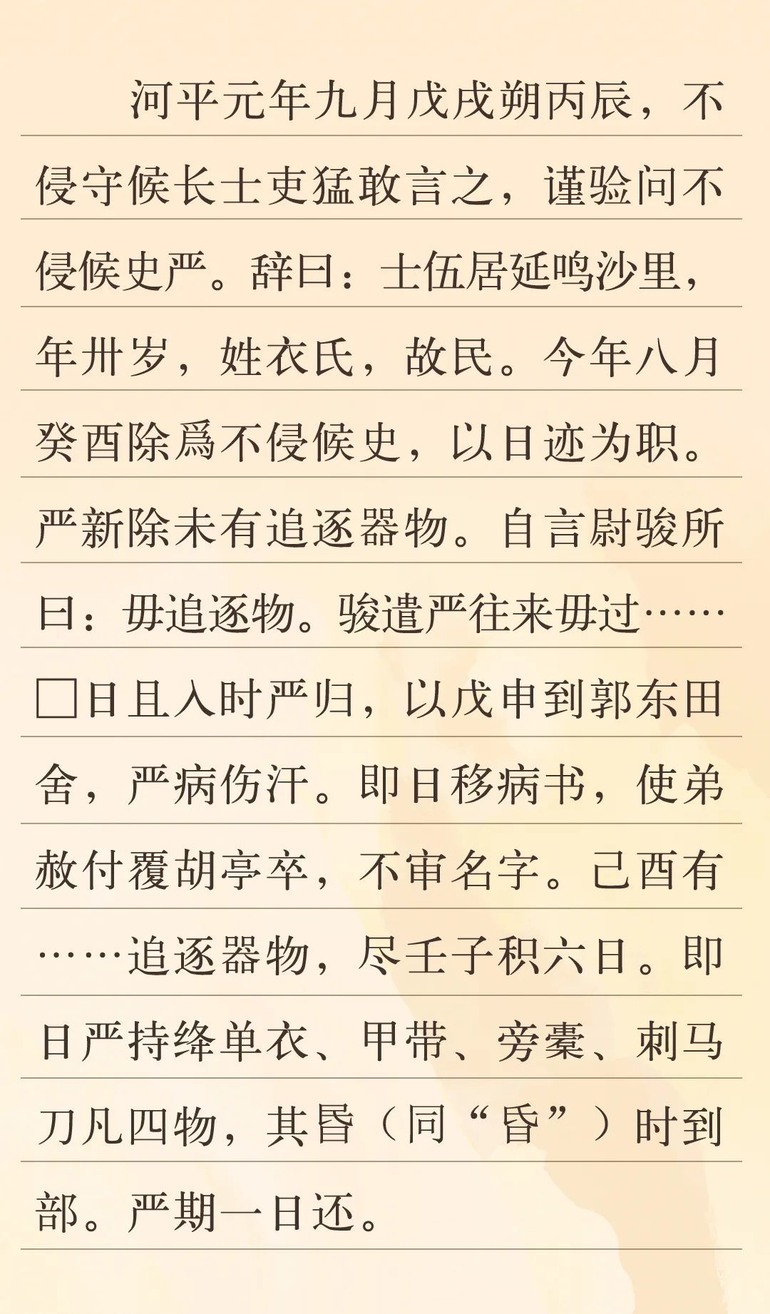 從行文方向上講,為公元前28年11月3日甲渠候官不侵部士吏孫猛向上級(jí)匯報(bào)的上行文書。主要記載了居延縣鳴沙里男子衣嚴(yán)初次擔(dān)任不侵部候史一職時(shí),未配備追捕逃亡人員必備的器具,于是他前往塞尉駿的治所詢問,在返回途中偶感風(fēng)寒,直到10月30日傍晚時(shí)分,才帶著刺馬刀等武器返回不侵候部,超出了約定期限。