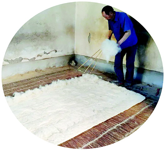 張建偉的搟氈手藝,是從清朝開始,祖上五代人代代傳承至今的。平時他就利用農(nóng)閑做一點,雖說很辛苦,但夫妻倆一起干,早年用腳踩,現(xiàn)在用機器搟,省力且高效,每天還能多搟一兩張。  喝一口罐罐茶,張建偉淡淡一笑說,手工搟的羊毛氈能用五六十年,隔濕效果非常好,去南方上大學的學生,都喜歡小氈褥子。老年人冬天將毛氈鋪在火炕上,暖和不易燃。有人曾專程找到他,為長輩定做過一張500多元的毛氈。“經(jīng)常用對皮膚好,而且毛氈方便保存,只要撒點藥水就能防蟲。用久了、臟了,將洗衣粉、洗滌劑倒在氈上,用水管沖洗即可。”
