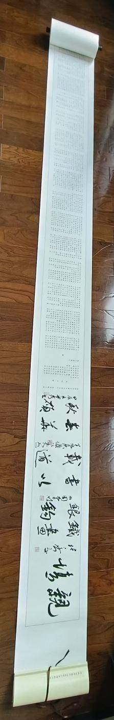 該長卷是白建新繼200米硬筆書法長卷《蛙》之后的又一部力作。作者耗時一年四個月,用硬筆楷書在四尺對開的宣紙上創(chuàng)作的《海峽兩岸著名作家系列 親情散文卷》,字體嚴(yán)謹(jǐn),書風(fēng)純正,字形一厘米見方,盡顯歐楷風(fēng)體。全篇近30萬字,共分5卷,幅長達(dá)250米。
