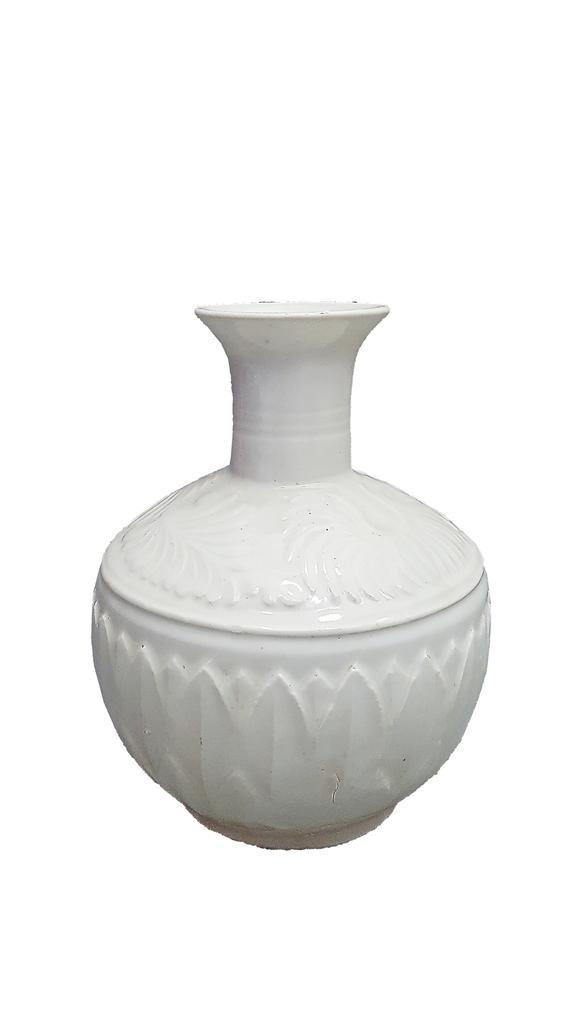 胎白質(zhì)細堅致,釉白瑩潤光亮。采用刻花技法。長頸呈喇叭口,圓唇。頸中部飾凹弦紋三道,器內(nèi)無釉。圓肩飾左右對稱的菊花紋,前后飾方向一致的菊葉紋。肩腹交接處飾凹弦紋一道,腹稍鼓下收,腹?jié)M刻三疊仰蓮紋。矮圈足,足底無釉,修足刀削痕明顯。
