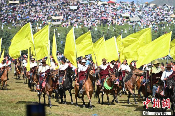 8月4日,藏族騎手在當(dāng)周草原上表演馬隊(duì)巡游。當(dāng)日,第22屆九色甘南香巴拉旅游藝術(shù)節(jié)在甘肅省甘南藏族自治州當(dāng)周草原開幕。人們身著節(jié)日盛裝載歌載舞、歡聚一堂,馬隊(duì)巡游、千人鍋莊舞等活動(dòng)精彩上演。九色甘南香巴拉旅游藝術(shù)節(jié)既是民眾浪山聚會(huì)的節(jié)日盛會(huì),也是展現(xiàn)發(fā)展成就、擴(kuò)大對(duì)外開放的重要窗口,更是展示民俗文化、促進(jìn)廣泛交往交流交融的有效載體。中新社記者 九美旦增 攝