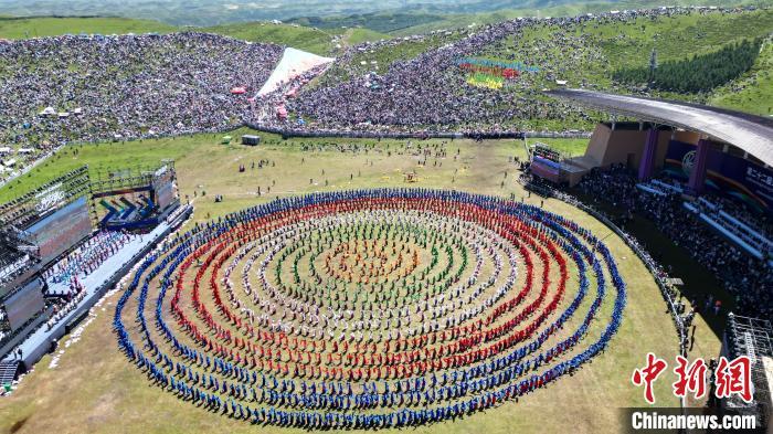 8月4日,第22屆九色甘南香巴拉旅游藝術(shù)節(jié)在甘肅省甘南藏族自治州當(dāng)周草原開幕。人們身著節(jié)日盛裝載歌載舞、歡聚一堂,馬隊(duì)巡游、千人鍋莊舞等活動(dòng)精彩上演。九色甘南香巴拉旅游藝術(shù)節(jié)既是民眾浪山聚會(huì)的節(jié)日盛會(huì),也是展現(xiàn)發(fā)展成就、擴(kuò)大對(duì)外開放的重要窗口,更是展示民俗文化、促進(jìn)廣泛交往交流交融的有效載體。圖為開幕式現(xiàn)場(chǎng)千人鍋莊舞表演。(無人機(jī)照片)中新社記者 九美旦增 攝