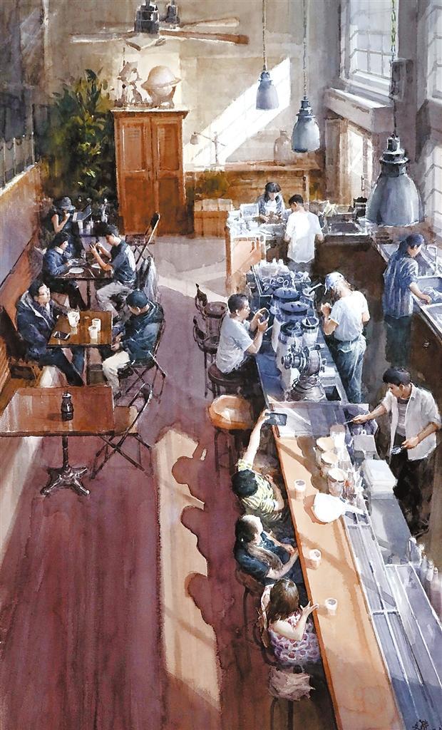 《網紅咖啡館的午后》用寫實方法展現(xiàn)了一個溫馨的生活場景。在構圖上,以俯視的角度用大場景來做整體畫面的籌劃,在整體色調上以沉穩(wěn)厚重的暖色作為基調,把光線穿插、引入到畫面中。在布局上,以陽光照耀下的咖啡館吧臺為主要表現(xiàn)組群,分別刻畫、塑造了工作中的前臺人員、打卡拍照的女性顧客群;把暗部區(qū)域,幾組在咖啡桌邊交談、用餐、喝咖啡的顧客群作為第二層次,展現(xiàn)他們不同的神情和體態(tài);然后完善整體的空間感。在用筆上盡量以松動的筆觸,又能展現(xiàn)細節(jié)的方式來塑造,利用水彩畫需要干、濕、松、緊相結合,多層次、多遍數進行渲染的特性,盡可能達到預期效果。 (本版文圖由甘肅省美術家協(xié)會提供)