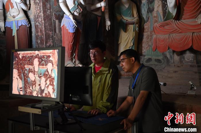 6月5日,敦煌莫高窟內,敦煌研究院文物數字化研究所工作人員進行敦煌壁畫數字化圖像現(xiàn)場檢查工作。中新社記者 李亞龍 攝
