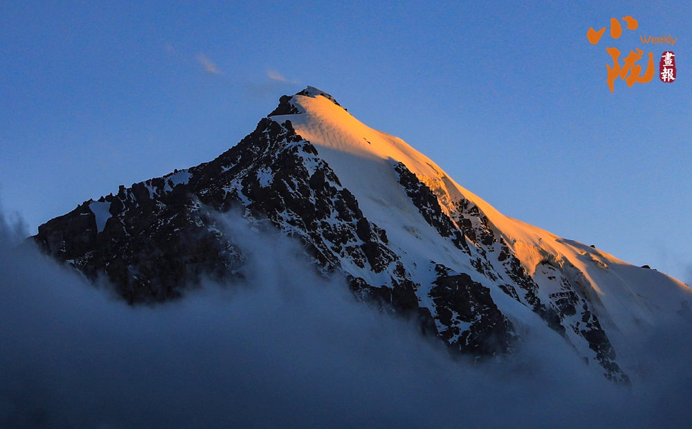 雪山山巒間,云霧回旋飄動,彌漫舒展,如海浪起伏、波濤滾滾一般,與湛藍(lán)天空相互映襯,壯美如畫。