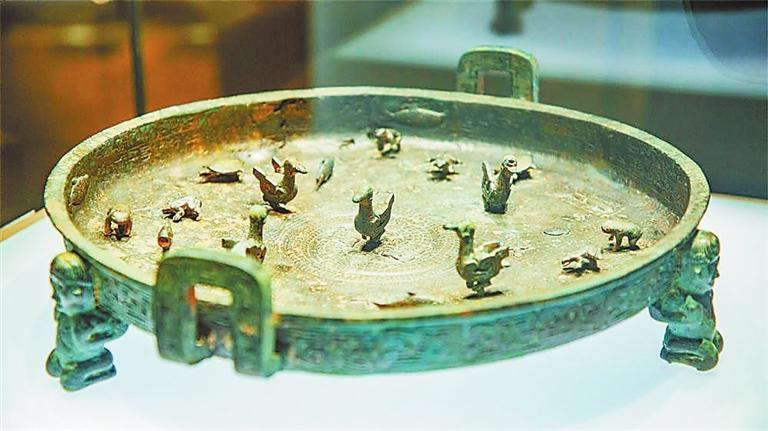不同于大多數青銅盤,晉公盤的平底淺腹內,鑄有眾多的立體動物雕塑。在它底部中心有一對浮雕游龍回旋盤繞,雙龍之內站著一只水鳥,雙龍之外又有四只水鳥和四只烏龜。再向外延,又有三只青蛙和三條游魚。最外一圈,是數只青蛙和烏龜,它們或蹲或游,或者爬行,非常生動鮮活。這些動物的制作展示了工匠的心靈巧思,鳥喙可以自由開合,龜首能夠如意伸縮,原地還能進行360度轉體,既體現了青銅冶鑄技術的高超,亦體現了機械制作技術的進步。